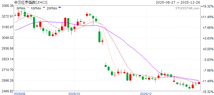 | 20251226 | 中汉红枣指数 | 价格收益 | 2573.565 | 0.392% | 0.957% | -1.731% | -16.790% | -7.387% | -17.726% |