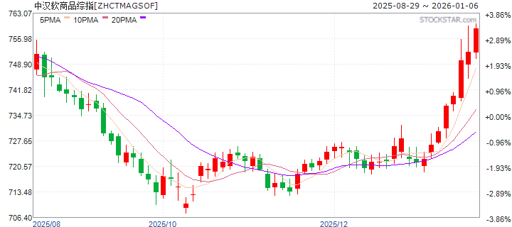 指数介绍: 中汉商品期货软商品综合指数是由专业指数公司编制的一个软商品期货指数。它选取郑商所上市的白糖、棉花这2个商品期货品种作为样本。每个商品是以持仓量,成交量和消费量综合权重。指数的起始日为2010年12月31日,初始值为1000点。 该指数精确显示在不使用杠杆情况下,中国软商品板块的收益率即贝塔(BETA)。投资者无须借助任何主动性操作,只要选择中汉软商品期货指数投资,就应预期获得该指数的收益率。它也是衡量主动型期货投资业绩的一个有效基准。